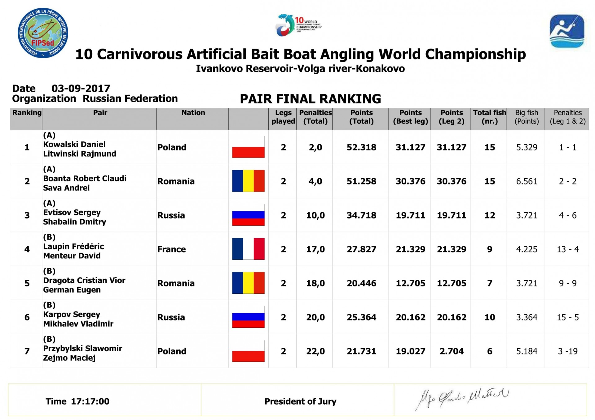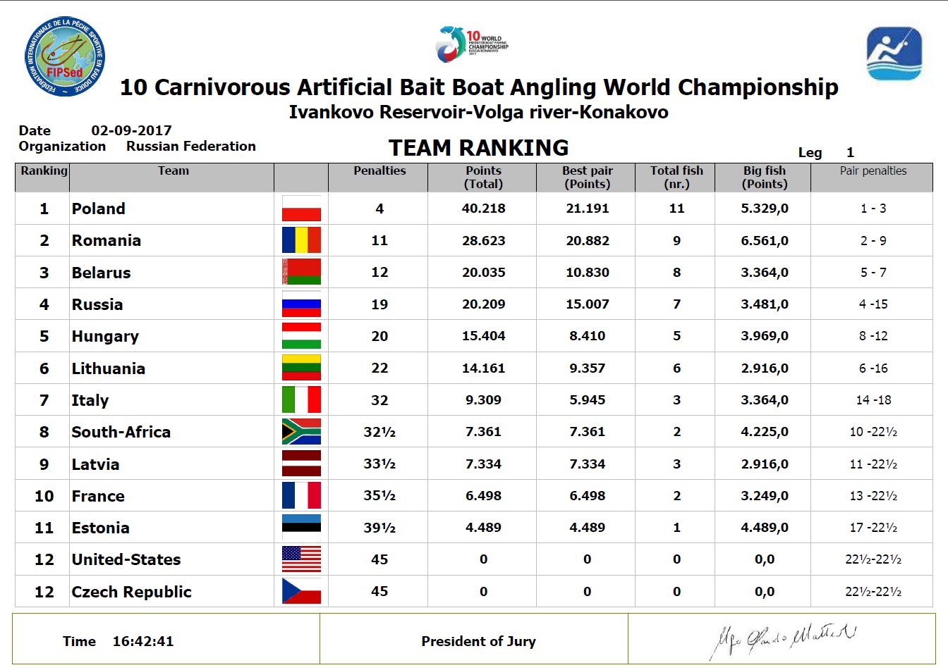 Сергей Никулин Опубликовано 11 сентября, 2017 Опубликовано 11 сентября, 2017 Чемпионат мира 2017. Часть 2 - выступление. Чемпионат Мира в Конаково – лучший турнир, на котором мне доводилось бывать! Это было очень круто! Невероятный драйв! Невероятные ощущения! Неповторимая атмосфера бескомпромиссной спортивной борьбы и дружеское общение между спортсменами разных стран, которому не мешал языковой барьер. Выдели бы вы, как делятся впечатлениями о прошедшем турнире француз и русский, о поимках крупной рыбы и сходах невероятных трофеев, не зная языка, но понимая друг друга! Сюжет из популярного фильма, когда Кузьмич упускает щуку Вилле, придуман не на пустом месте. Привет друзья, если вы читаете! Hello guys! доброжелательным парням из США. Hello Nate! Привет братьям славянам из Белоруссии! Привет Павел из Венгрии! Павел следил за соблюдением правил и нарушениями со стороны соперников по отношению к нам больше чем наш русский драйвер у соперников) Привет литовским друзьям! Привет Янас! Привет парням из Эстонии! Привет всем друзьям! Простите, если кого забыл упомянуть! Было очень приятно со всеми вами познакомиться и общаться! Я бесконечно благодарен напарнику Саше Юрову, тренеру Владимиру Иноземцеву, команде Дмитрию Шабалину, Сергею Евтисову, Сергею Карпову и Володе Михалеву, судьям и всем, кто непосредственно участвовал в подготовке и организации этого спортивного праздника! Конечно же, спасибо болельщикам! Друзья, ваша поддержка чувствовалась все это время. Отдельная благодарность за то, что не забыли нас тогда, когда это было важнее всего. Спасибо вам! Иванька – сложный, очень сложный водоем, на первый взгляд. Сложность его обусловлена невероятным рельефом и непредсказуемым поведением судака. Многие команды, приехавшие на турнир, сделали правильный вывод – обыграть русских на этом водоеме судаком не возможно. Кто-то из гостей, начитавшись наших форумов и переняв устоявшийся стереотип о Иваньке, как о чисто судаковом водоеме, приложил огромные усилия, тренируя эту рыбу еще летом. Но этого оказалось мало! Те, кто отбросил судака сразу, свою рыбу нашли. Это была щука-травянка. На Иваньке она была даже летом. Причем ее размер и количество часто играли сильнее судака, что было видно на наших отборах. Логично было предположить, что осенью ее должно было стать больше. При этом, клев судака, наоборот стихал. Тренировки нашей сборной давали нам огромное преимущество. Комплексное знание водоема у нас несравнимо лучше соперников. Однако, правильные выводы польской и румынской команд, сосредоточивших усилия на травянке, принесли им плоды. В данной «теме» мы оказались в равных условиях. По результатам официальных тренировок накануне старта нашей командой были наработаны сразу три темы: щука, судак и жерех, которого оказалось в количестве и качестве. Было очевидно, что основные соперники будут работать по щуке. Это было хорошо видно на тренировках. На судака мало кто вставал. Практически все соперники нарабатывали щуку. Перед стартом на сборе команды принято решение - ни в коем случае не отдавать травянку на наших участках сопернику. Делаем основной упор на щуку в траве. В случае ее пассивности переключаемся на судака. Жереха оставляем на отскок, как «туза в рукаве». Такова установка на тур. На старт собираю три комплекта: 1. Щука в траве – Maximus Ultimatum 21 ML с катушк